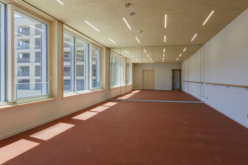 Die „Neue Ziegelei“ überzeugt durch einen klaren, funktionalen Grundriss. Öffentliche Bereiche sowie Verwaltungs- und Funktionsräume befinden sich entlang einer zentralen Foyerachse, was Übersichtlichkeit und Orientierung erleichtert. Großflächige Verglasungen fördern Transparenz und schaffen eine einladende Atmosphäre. Der rund 230 m² große Kultursaal im Obergeschoss ist flexibel bespielbar und bietet Platz für bis zu 300 Personen für Konzerte, Vorträge, Theater oder als Speisesaal des ASZ.