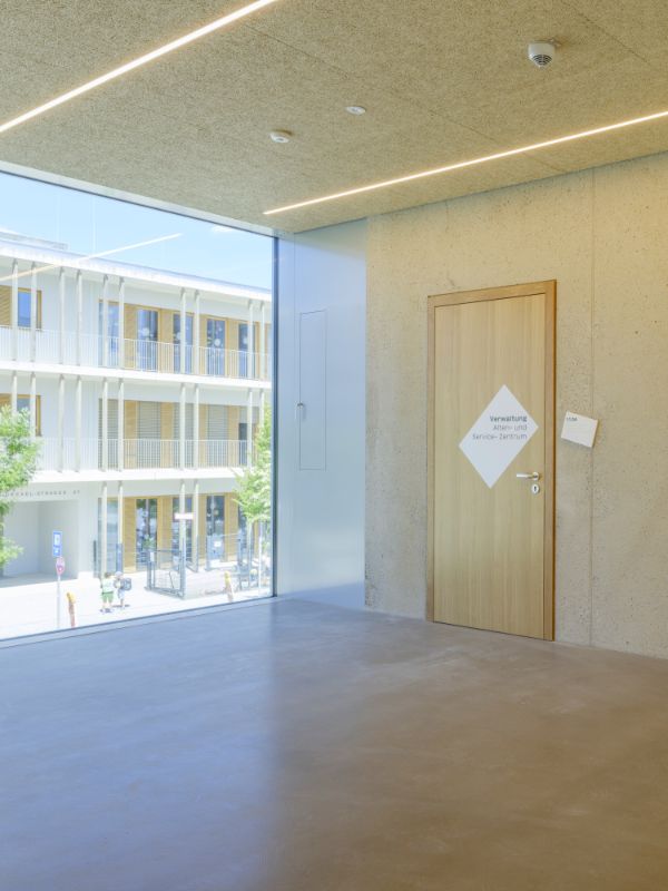 Ein durchgehendes Foyer wirkt als offenes Quartiersscharnier und verbindet so den Maria-Nindl-Platz mit der benachbarten Ruth-Drexel-Schule. Es dient auch als Raum für informelle Begegnungen, Ausstellungen und kulturelle Aktivitäten. So trägt die „Neue Ziegelei“ architektonisch und funktional auf vielfältige Weise zur sozialen Vernetzung im Viertel bei.