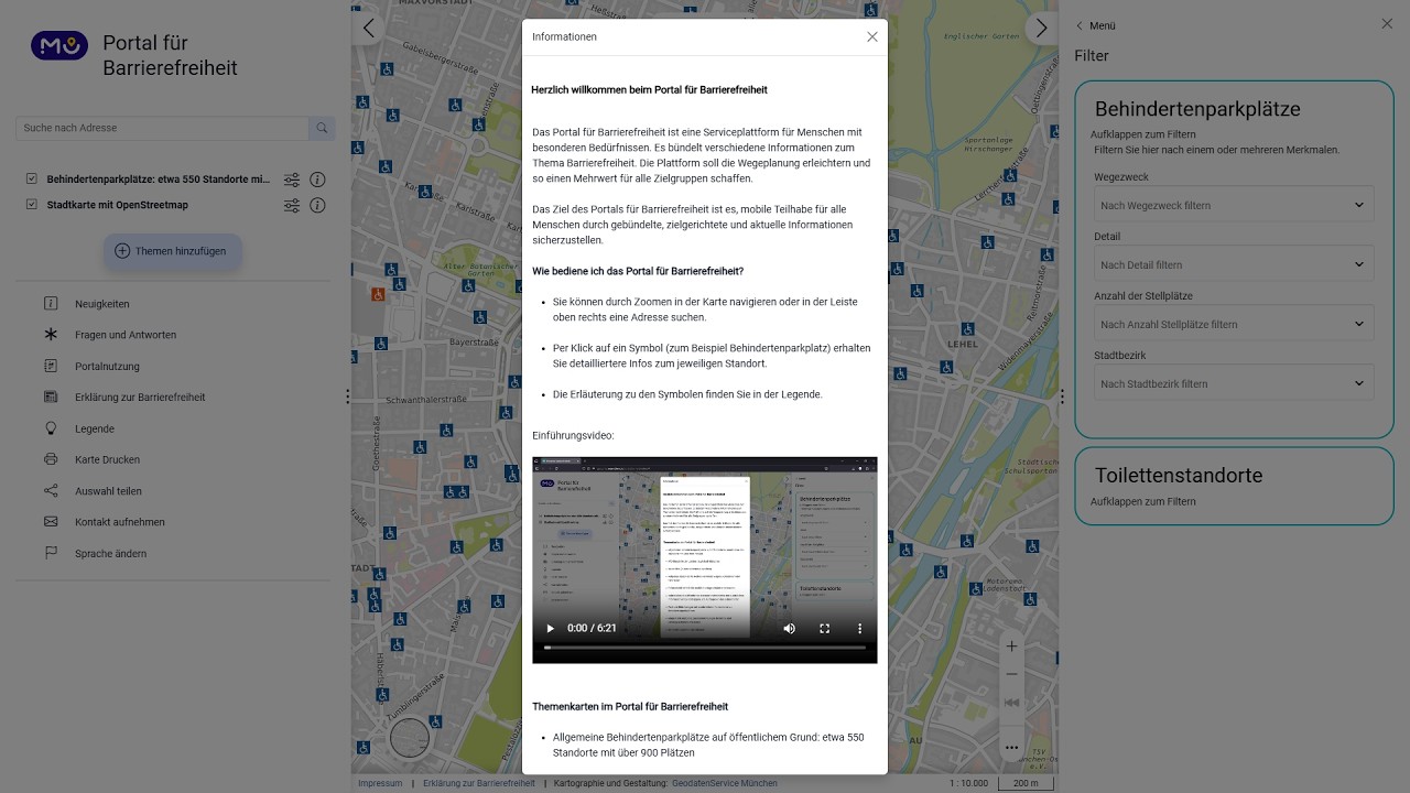 Die Anfangskarte stellt die Behindertenparkplätze und öffentlichen WCs dar, alles andere kann im Bereich "Fachthemen" hinzu oder abgewählt werden.
