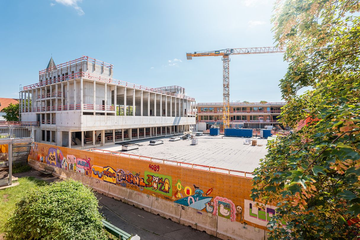 Der Rohbau des Sporttrakts und der Mittelschule ist abgeschlossen. Zudem hat der Einbau der Holzfassade an der Mittelschule begonnen.