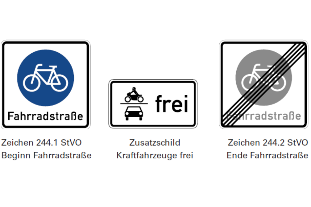 Bei einer Fahrradstraße bekommt die ganze Fahrbahn die Funktion eines Radweges. Radler*innen dürfen nebeneinander fahren. Nur, wenn die Zusatzschilder „Anlieger frei“ oder „Kraftfahrzeuge frei“ hängen, dürfen auch motorisierte Verkehrsteilnehmer die Fahrradstraße befahren. Sie müssen sich aber der Geschwindigkeit des Radverkehrs anpassen und dürfen 30 Stundenkilometer nicht überschreiten.