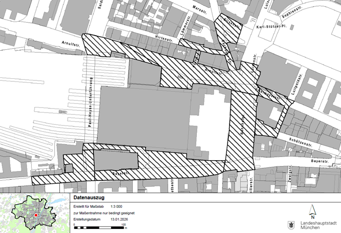 Bahnhofplatz, Kreuzungsbereich Bahnhofplatz / Arnulfstraße bis Höhe Luisenstraße 1, Dachauer Straße bis einschließlich Anwesen Dachauer Straße 7 und gegenüberliegend bis zur Elisenstraße / Ecke Luisengymnasium, am Luisengymnasium in der Elisenstraße entlang in östliche Richtung bis zum Ende des an dem Gehweg angrenzenden Gebäudeteils des Luisengymnasiums, Richtung Süden bis zum Anwesen Elisenstraße 5 (die Begrenzung verläuft zwischen den Anwesen Elisenstraße 5 und Dachauer Straße 4), Hirtenstraße von Dachauer Straße bis Lämmerstraße, Arnulfstraße bis Kreuzungsbereich Paul-Heyse-Unterführung, Pfefferstraße, Bayerstraße beginnend ab Höhe Hausnummer 24 bis einschließlich Kreuzungsbereich Schillerstraße, Paul-Heyse-Unterführung zwischen den Anwesen Bayerstraße 16 a und Kreuzung Bayerstraße, Schützenstraße ab Bahnhofplatz bis Kreuzung Luitpoldstraße, Luitpoldstraße zwischen Schützenstraße und Prielmayerstraße sowie Prielmayerstraße ab Bahnhofplatz bis Kreuzung Luitpoldstraße.